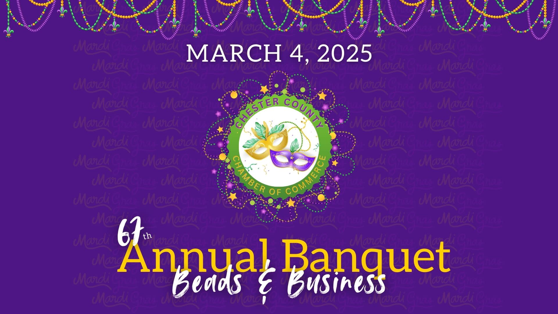Join us on “Fat Tuesday” March 4, 2025, as we commemorate the Chamber’s 67th annual banquet “Beads & Business.” This signature event celebrates the contributions of every member in strengthening our Chamber and driving the prosperity of Chester County’s economy. To ensure inclusivity, we offer sponsorship opportunities to businesses, industries, and not-for-profits across all sectors. Sponsorships provide an avenue to make the evening memorable, showcase your brand, and promote your products and services to hundreds of local business leaders.