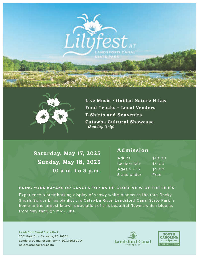 Join the fun at this annual event with food trucks, local vendors, live music, presentations by the Catawba Cultural Center (Sunday only), and, of course, the blooming of the rare Rocky Shoals Spider Lilies!