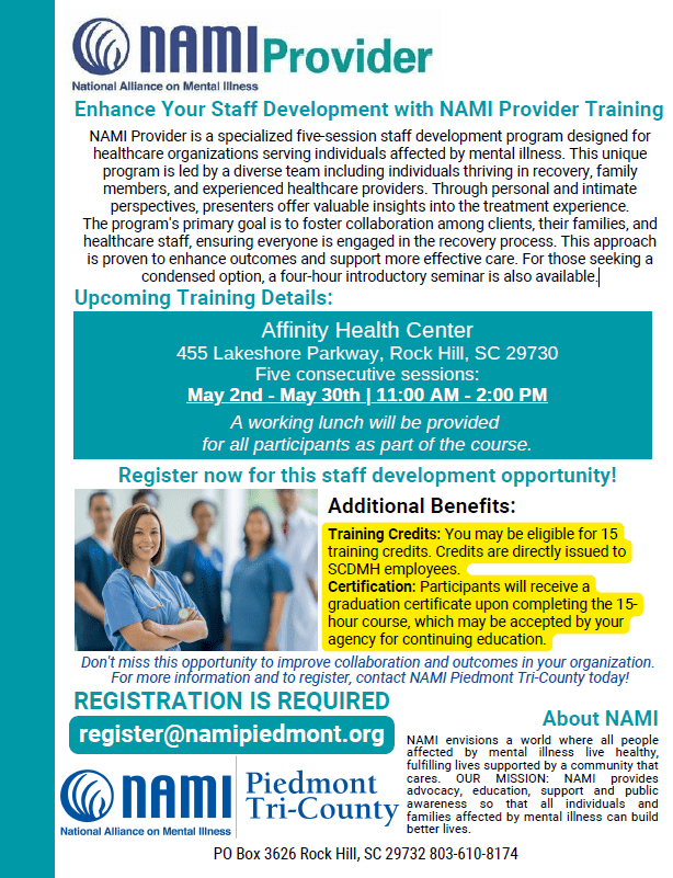 NAMI Provider is a five-session staff development program for healthcare organizations serving individuals with mental illness. Led by a team of individuals in recovery, family members, and healthcare providers, it offers personal insights to improve collaboration between clients, families, and staff. A four-hour introductory seminar is also available.Images