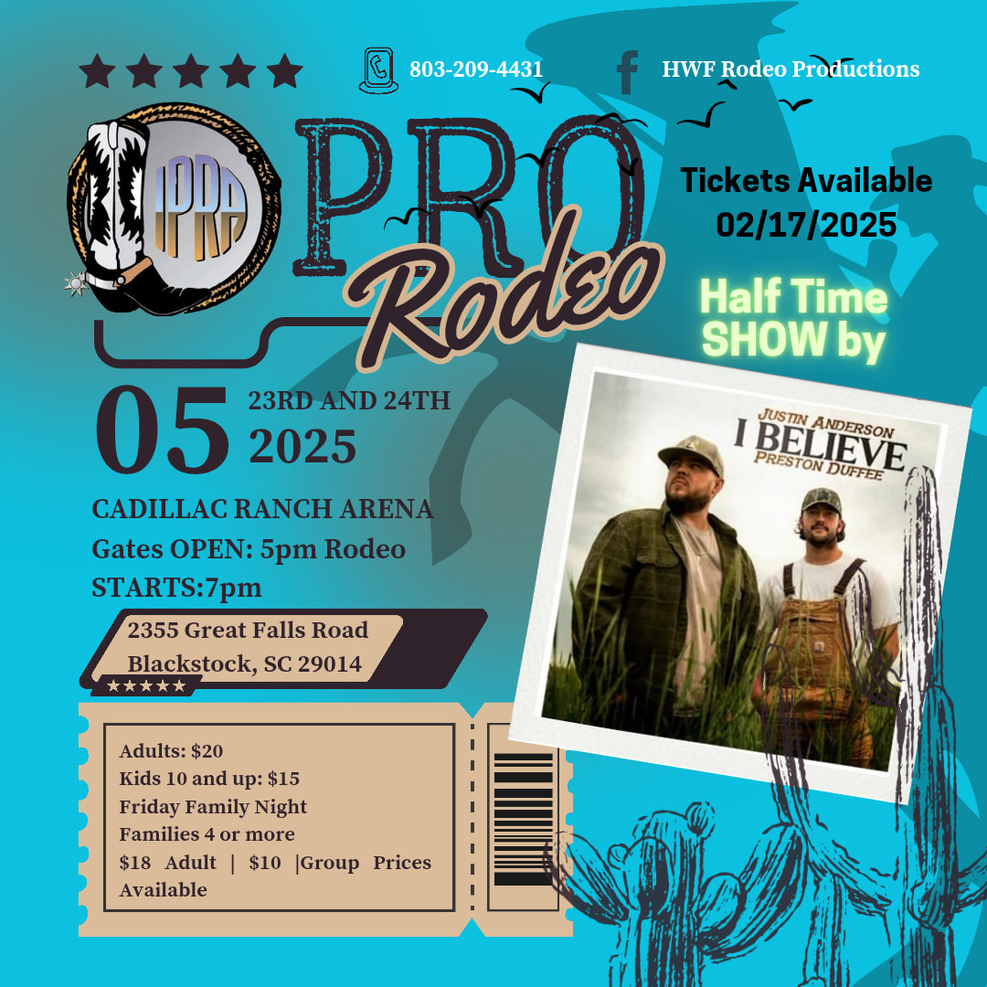 Join us for an action-packed rodeo featuring a live music performance at halftime! Experience the perfect blend of cowboy grit and great tunes for a night of unforgettable entertainment.Images